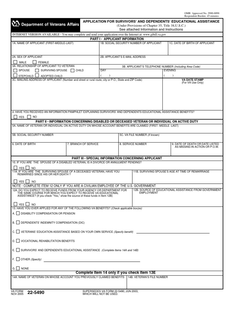 22 5490 Va Form - Use your va education benefits to pay for college or training programs. Mail the completed form to the va regional processing office for the region of that. If you are over the age of 18 once. Apply for va education benefits for dependents online. Find more information about va education and training programs and relevant.