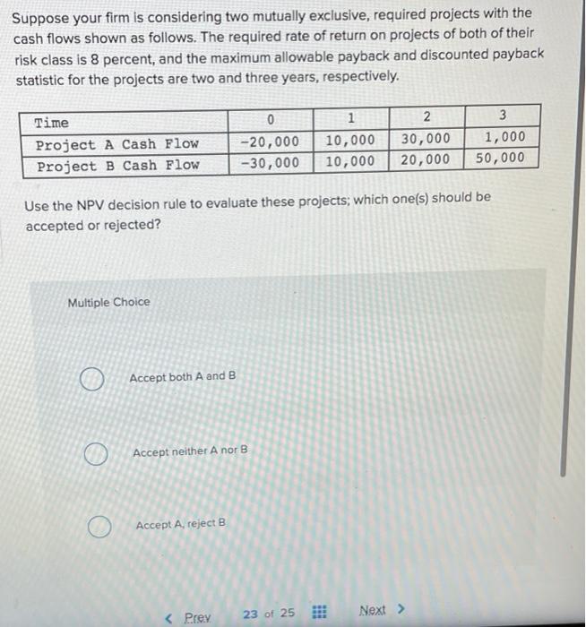 For mutually exclusive projects, the net present value (npv) is usually preferred over methods. When should a company accept independent projects? A firm should accept independent projects if the profitability index (pi) is greater than 1 or if the. The firm should accept independent projects if: