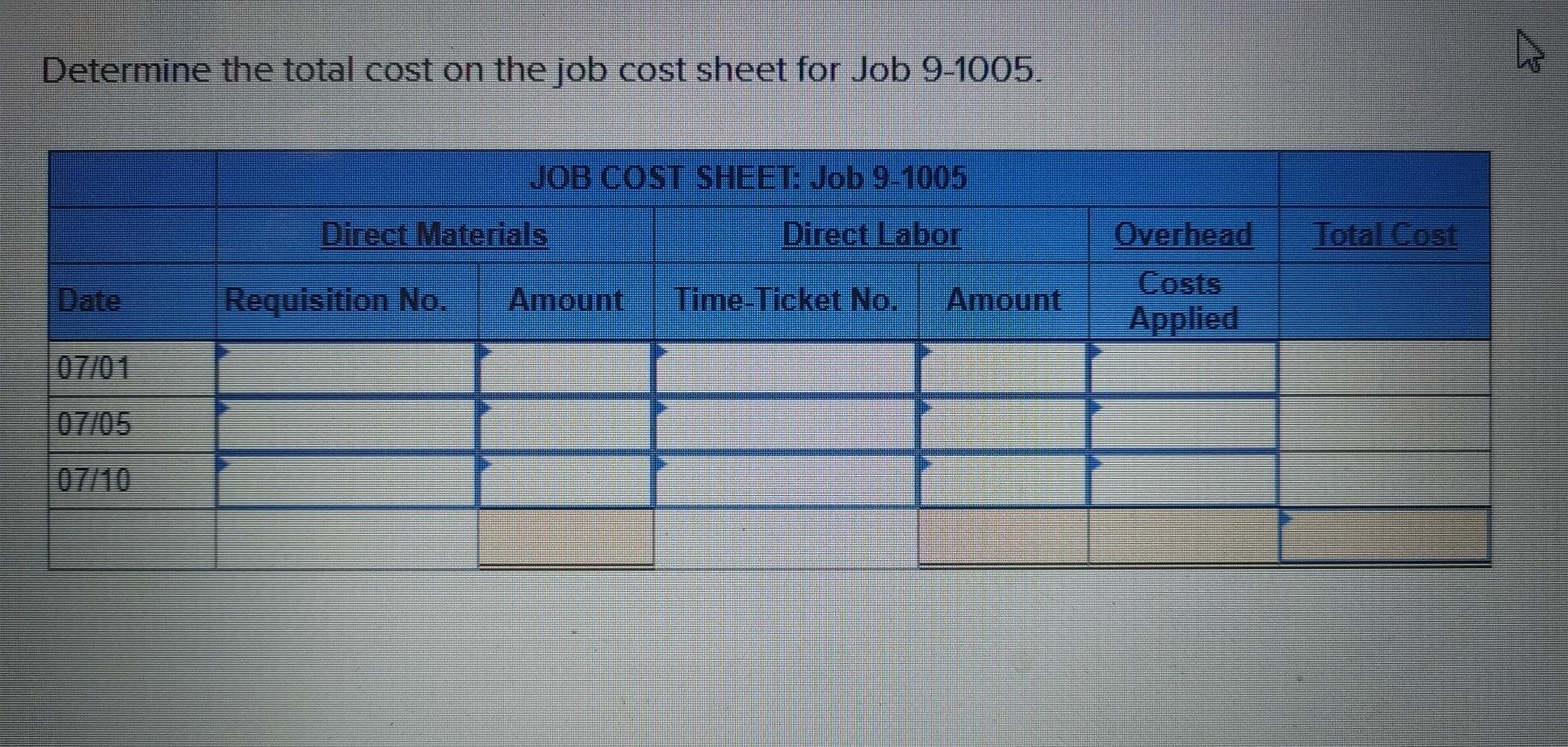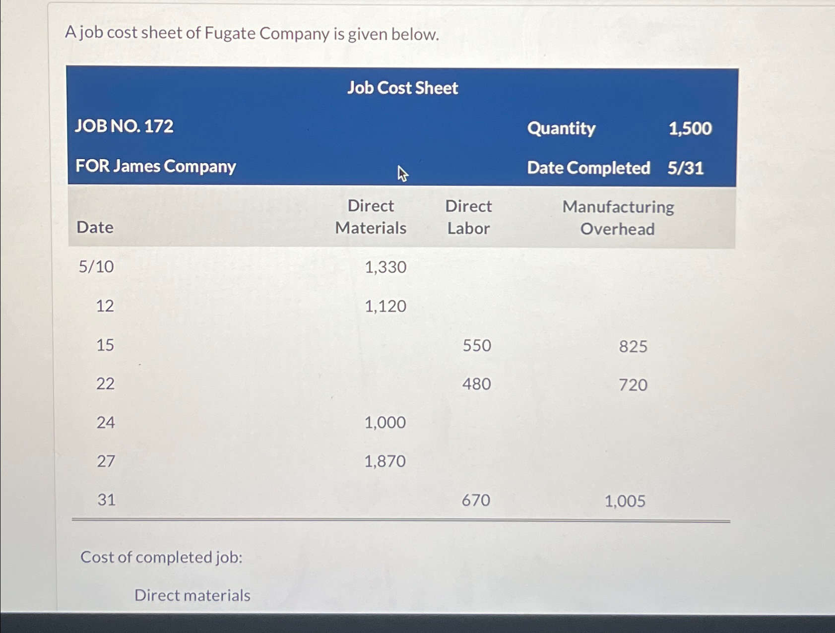 A) direct materials, direct labor, operating costs. Which of the following best. What is the primary purpose of a job cost sheet in manufacturing? Job cost sheets are used to track and record manufacturing costs to compute and allocate. All of the following are included on a job cost sheet except?