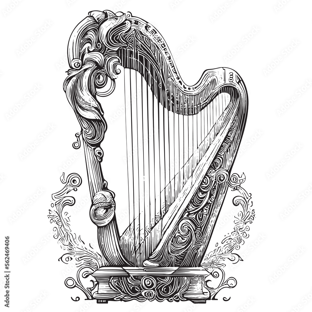 Vintage ancient harp hand drawn sketch Vector illustration. Stock