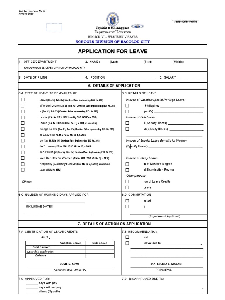 8) by barry jessie digol november 8, 2023 download download 378 file size 541.22 kb. Vacation leave within in the philippines or abroad shall be indicated in the form for purposes of securing travel authority and completing. Explore educational excellence with deped division of bukidnon. Application for leave (csc form no. Application for leave details of applicationcsc form 6 revised.