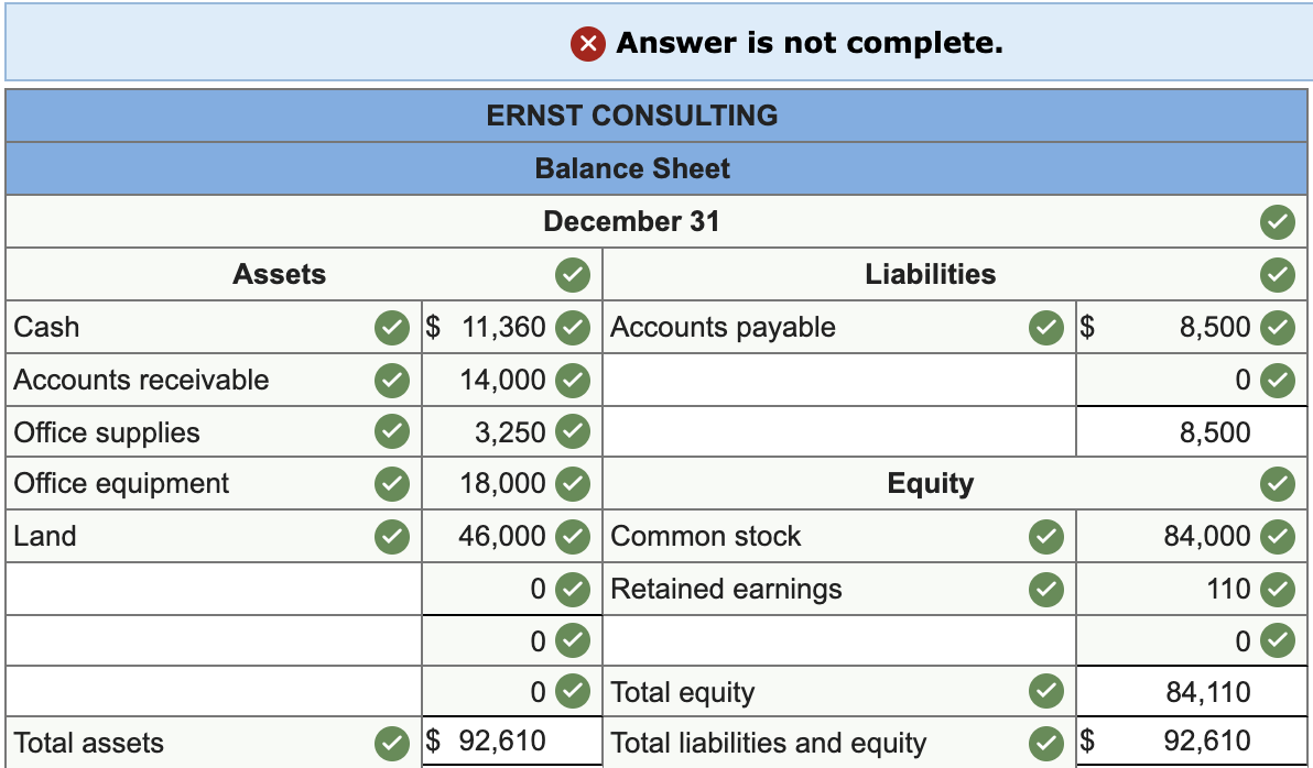 The december 31 balance sheet for ernst consulting includes total assets of $83,700, total liabilities of $690, and total equity of $83,010. Sure, i can help you prepare a balance sheet for ernst consulting. A balance sheet is a financial statement that reports a company's assets,.
