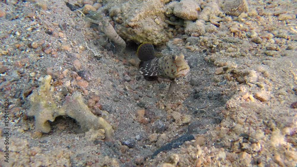 Pistol shrimp and goby fish symbiotic pair, coral reef home A pistol