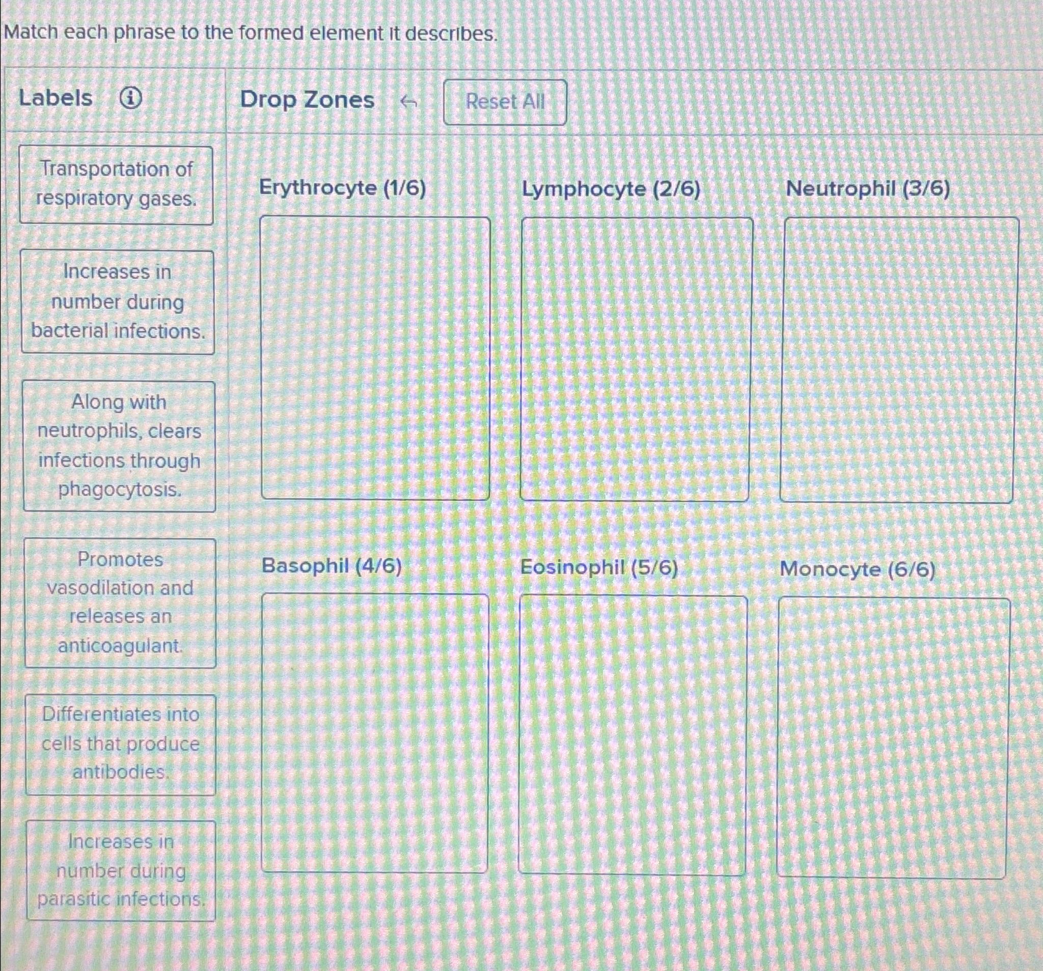 Match each phrase to the formed element it describes. Match each phrase to the formed element it describes. The student's schoolwork question is asking to match various descriptions of blood cells with. Match each phrase to the formed element it describes.