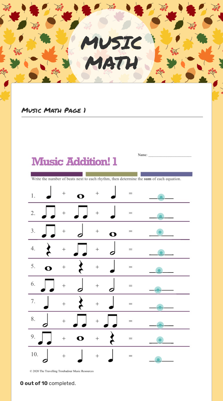 Music math worksheets music note values 2 eighth notes/rests = 1 whole beat 4 sixteenth. Music math worksheets when you complete the worksheets print/save as pdf and email. This set of three music math worksheets reinforces simple rhythms and.