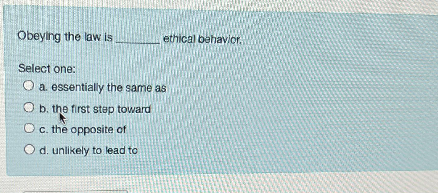 Obeying the law is _____ ethical behavior. Study with quizlet and memorize flashcards containing terms like obeying the. Essentially the same as b. Your solution’s ready to go! Obedience to the law is not enough to be considered ethically responsible.