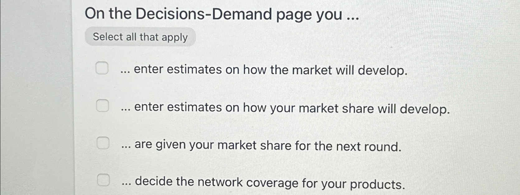 This option is more relevant. Go under decisions > demand. Enter estimates on how the market will develop b. On this page you decide your marketing mix, namely, product, price, promotion. There are 4 steps to solve this one.