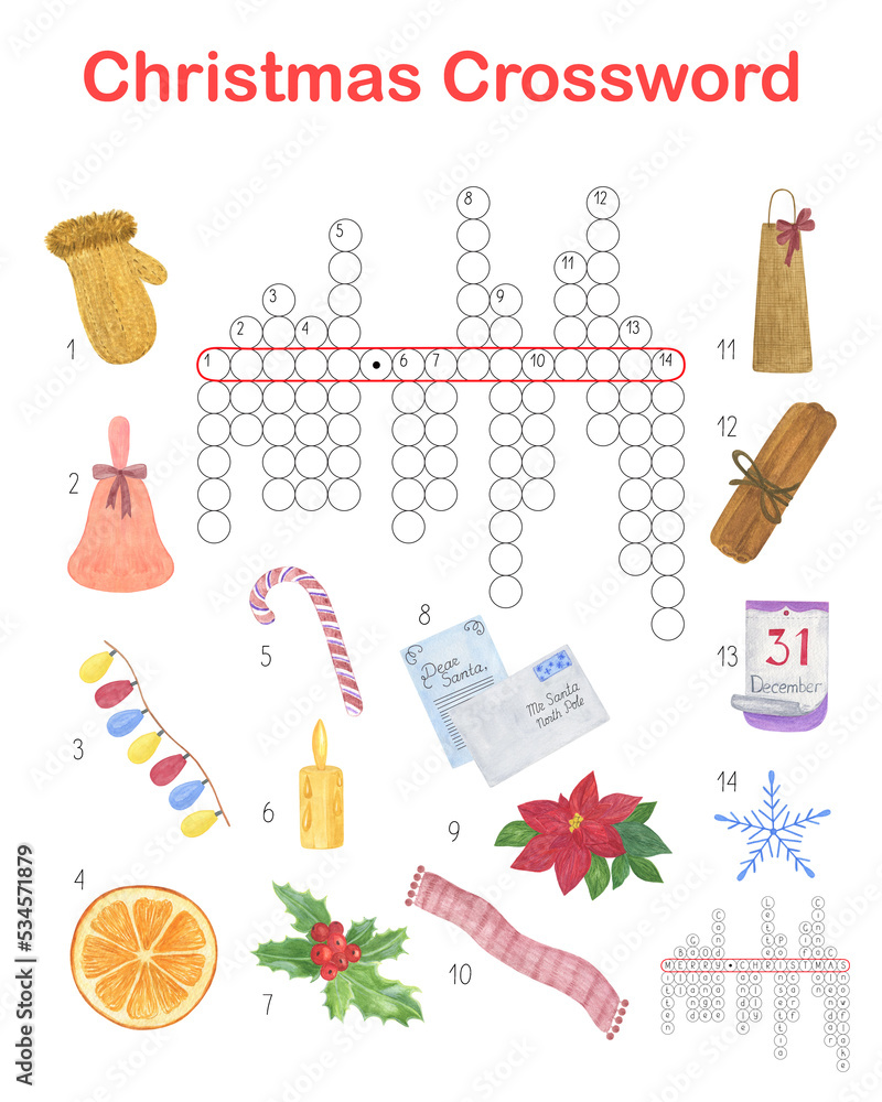 Christmas seasonal crossword word search puzzle, winter holidays