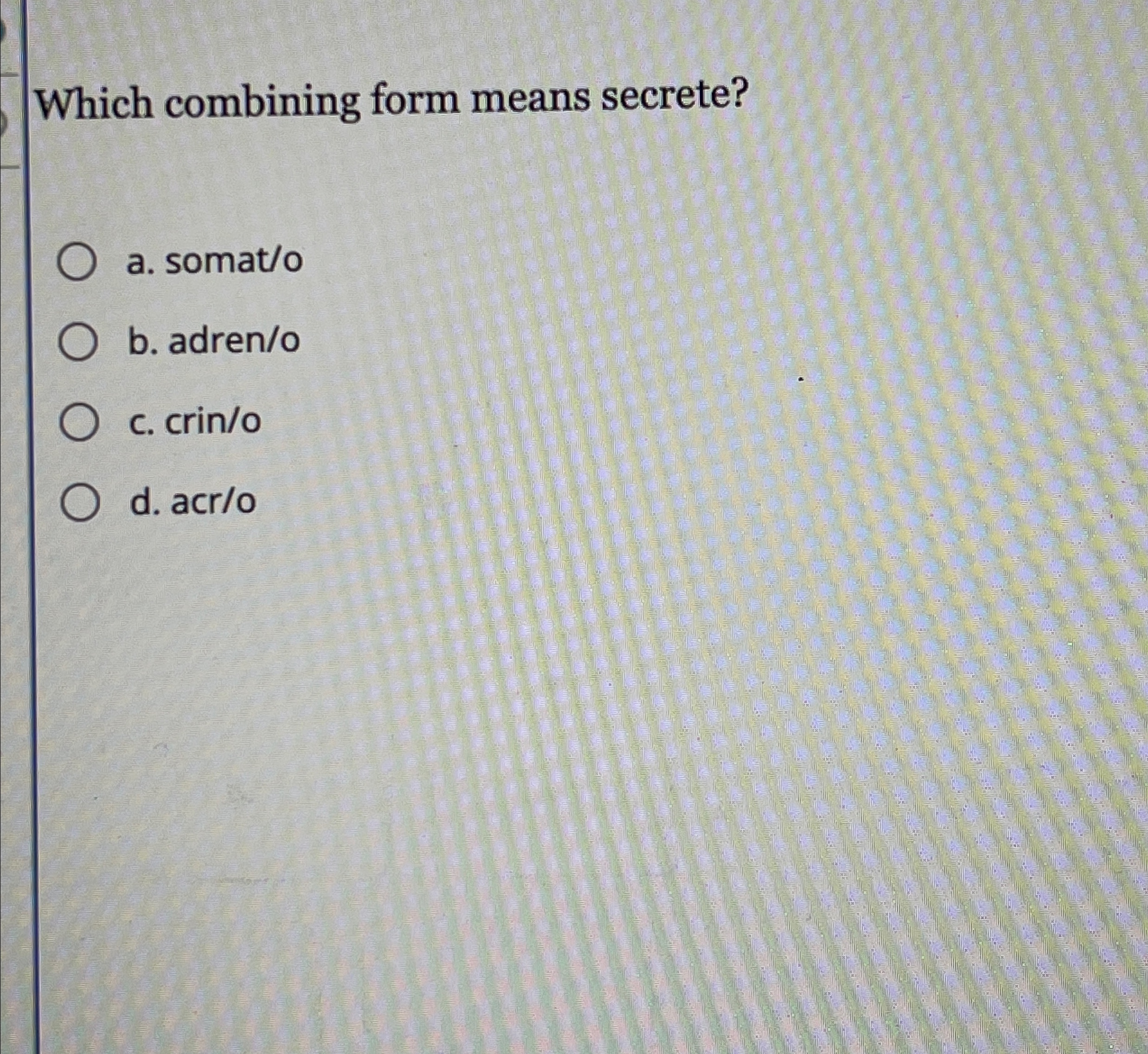 Solved Which combining form means secrete?a. somat/ob.